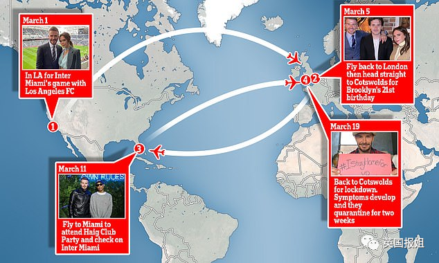 果然几天后,几位为贝克汉姆夫妇工作的员工被确诊,但当时贝克汉姆夫妇还没有任何症状。他们继续英国飞美国,美国飞英国。