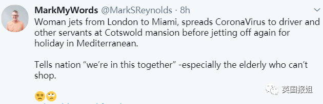 “蠢人干蠢事。我不相信,三月啊,他们还从洛杉矶飞到科茨沃尔德,再飞到迈阿密。毫无疑问,这个过程要与成千上万的人接触。而那时意大利的医院已经要崩溃了,死亡人数每日飙升几百人。他们怕是不看新闻吧?”