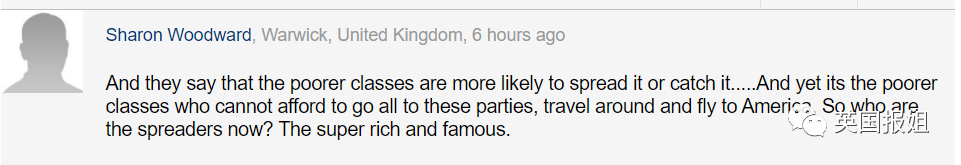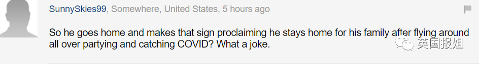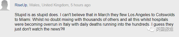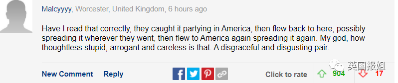 网友:“我没看错吧?他们在美国的聚会上染了病,然后飞回了英国,然后可能传播得到处都是,然后又飞回美国传播一次。我的神啊,多么愚蠢、傲慢和漠不关心。这可耻又恶心的一对儿。”