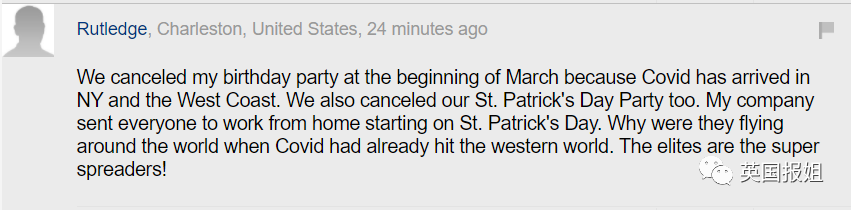 “三月初,我们家取消了我的生日派对,因为我们担心纽约和西海岸的疫情会扩散。我们也取消了圣帕特里克节的聚会。我的公司从圣帕特里克节让大家居家办公了。为什么他们还在世界各地飞来飞去,而新冠已经袭击了整个欧美?精英们才是超级传播者!”