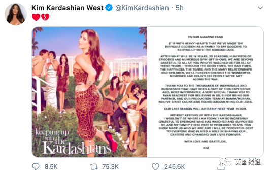 “致我们超棒的粉丝,我代表一家人,带着沉重的心情宣布,在艰难抉择后,我们决定向《与卡戴珊一家同行》说再见。”