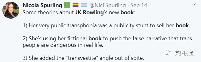 但对于支持跨性别群体的网友而言,罗琳的新书绝非那么单纯,别人写可以说是巧合,罗琳写就很可疑: