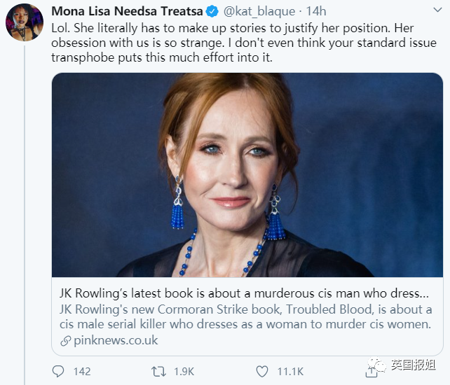 “JK罗琳的新书讲了一个顺性别女调查一个专杀女人的,异装癖顺性别男。就......罗琳还需要多明目张胆告诉世界她是个仇跨性别者,你们才会停止买她的书,出版商才会放弃她?”