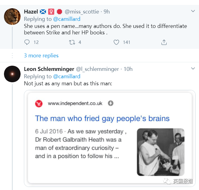 还有一个巧合引起的风波。罗琳在写侦探小说时用的这个叫Robert Galbraith的笔名,恰好和一个开创点击疗法“治愈”同性恋的精神医生重名,受到了一些同志粉丝的反对。