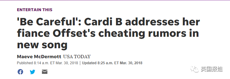 后来卡老师向《大都会》证实了这个传言,并说“我想和我的男人解决这个问题,没必要解释为什么”,还出了首新歌《Be careful》,被人指出里面的歌词其实是对Offset的警告,可以说是字字锥心了。