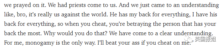 采访中还提到,他们夫妻为了解决婚姻问题还去向牧师求助,也就是这时,他们俩达成了一个共识:我们互相支持对方的一切,如果你骗人了,那你就是在骗那个最支持你的人,为什么要这样做呢?我们要一起对抗这个世界,对我来说,一夫一妻制是唯一的办法,如果你出轨了,我就揍你。
