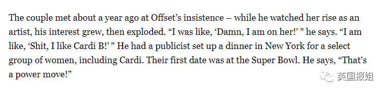 2016年,Cardi B和Offset在一场活动中相遇,卡老师在接受采访的时候回忆起两人的初遇时,言语间不乏傲娇和甜蜜:“他当时是真的很想跟本可人儿说话呢”。