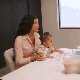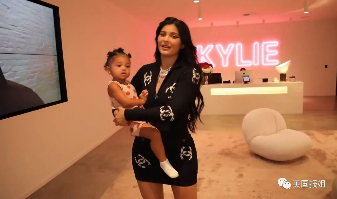 拍平面照时,让女儿看着自己工作。以女儿为名义发布的新彩妆,开会时也抱着女儿。尽管Stormi并不知道自己手上拿的资料是什么意思,凯莉也会询问女儿的意见。