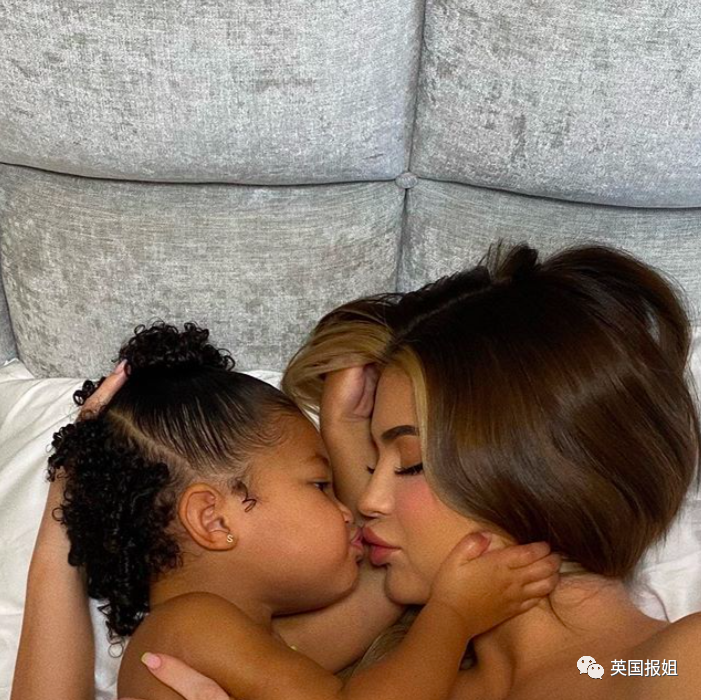 Tiktok上的家长躺孩子腿的挑战,凯莉躺到Stormi腿上时,女儿也是温柔地摸着妈妈说:“不要害怕。”
