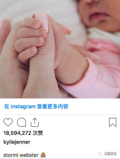 当时凯莉在自己已经超过1.97亿关注者的账号上,发布了女儿握着自己手的照片,也成了2018年度平台的点赞王。超过1850万人,赞了Stormi的出生。