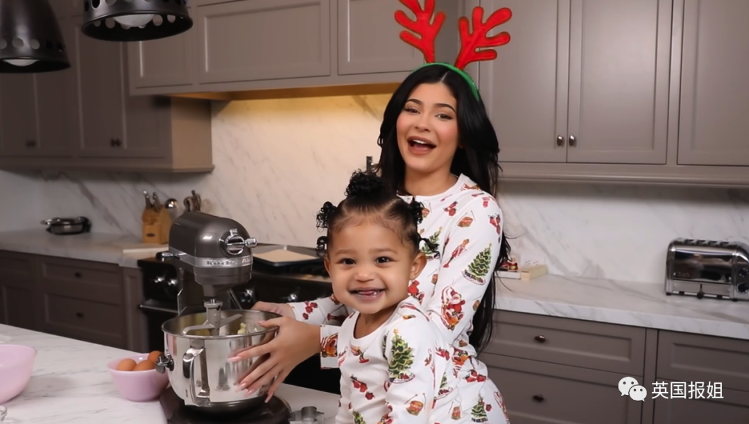比如去年圣诞节凯莉带着Stormi做饼干,言谈举止间,母女俩都是“谢谢、请”挂在口上。女儿不小心把香草精瓶打翻,凯莉也没生气,而是和孩子一起把东西擦干净。