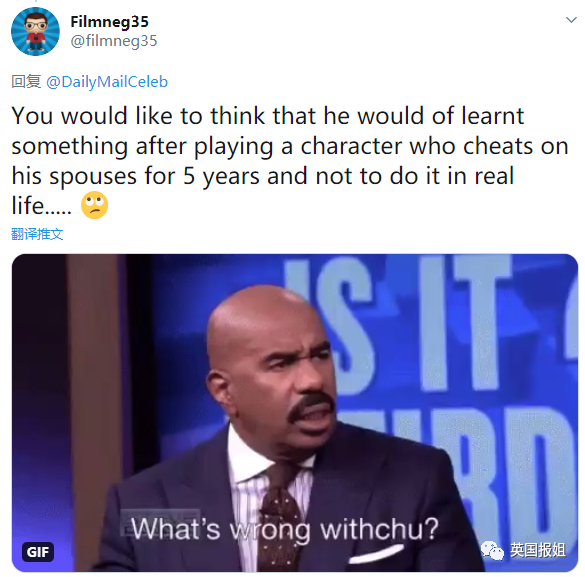 “这男的在演了一个出轨的角色五年之后,居然完全没有学到,不要把出轨这种破事带到现实生活中来吗…”