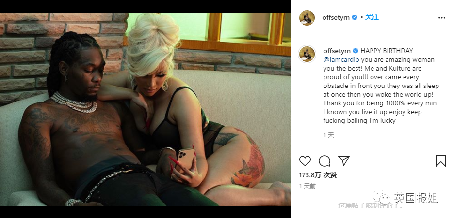 整个生日过得声势浩大,礼物满天飞,不过offset的某些操作也实在是过于迷惑。他在IG story上发了自拍并配文“我赢了”来回应那些吐槽他们离婚的人。