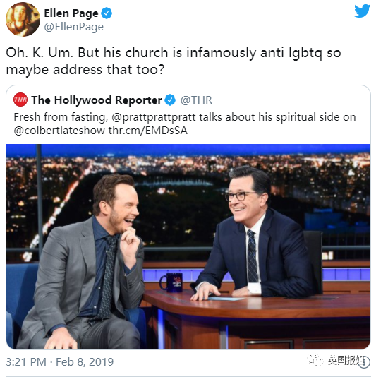 好莱坞女星艾伦佩姬(水果硬糖、盗梦空间主演,2014年公开出柜),就因为这个事儿非常看他不爽。在帕特说他在牧师启发下完成了21天的斋戒的时候,她还转发了这条报道讽刺道: