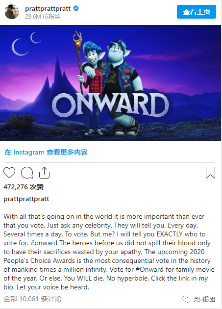 马上要来的2020年人民选择奖是人类历史上最重要的一次投票。为这部年度家庭电影投票吧!不然你就完了,不夸张。”
