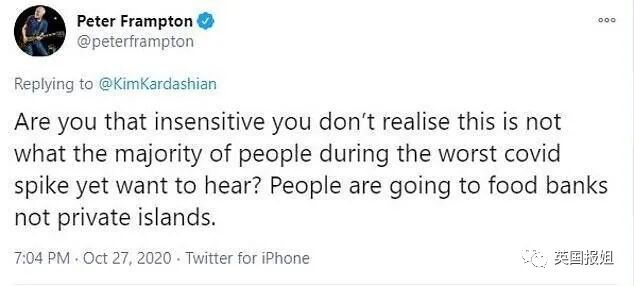 英国摇滚歌手Peter Frampton直接在金卡戴珊的推特下评论: