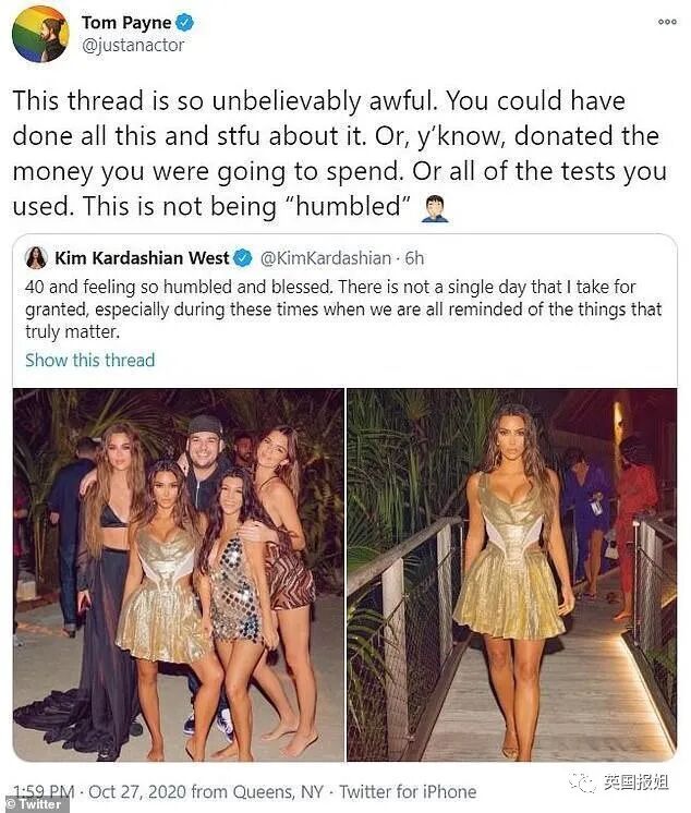参演过《行尸走肉》的演员Tom Payne直接说,金卡戴珊晒出的奢华派对一揽子照片“可怕得令人难以置信。”