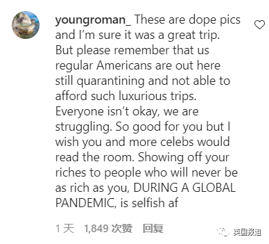“你是有多麻木不仁啊,你难道没意识到在如今严重的疫情期间大多数人并没有想要看你奢华的旅行吗?