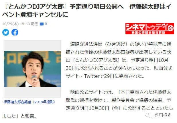 目前已知的是,由伊藤参演的电影《炸猪排DJ扬太郎》没有受到影响,在10月30日如期上映,但影片的宣传活动取消了他的登场安排。
