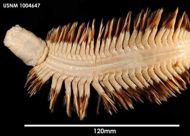 这种生活在南极海洋中的海洋蠕虫,看起来就像一把长约20cm的刷子,椭圆形的身体,两侧长满闪闪发光的金色鬃毛。