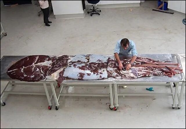 历史中捕获的大王酸浆鱿都是未成年的雌性,再加上生物样本太少,科学家们只能从动物胃里面的残肢来预估它成年后的体型。