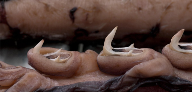 大王酸浆鱿和大王乌贼最大的区别在于触须,大王乌贼的触须上有大小不一的吸盘,而大王酸浆鱿的触须,则是带着尖锐倒刺的,这种钩刺长5厘米。
