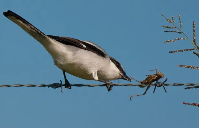 还有一种情况是,当伯劳捕杀了一只有毒的蚂蚱时,它必须将蚂蚱用铁丝穿起来晒几天,等蚂蚱体内的毒素分解后再食用。