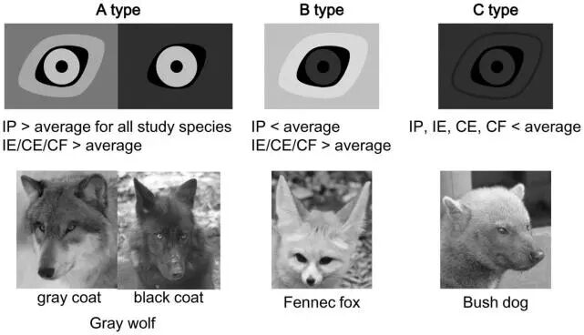 日本有关犬科动物的研究发现,不同的犬科动物的眼睛位置和瞳孔不同,有的眼睛和瞳孔位置明显,很容易看到,有的则类似伪装。