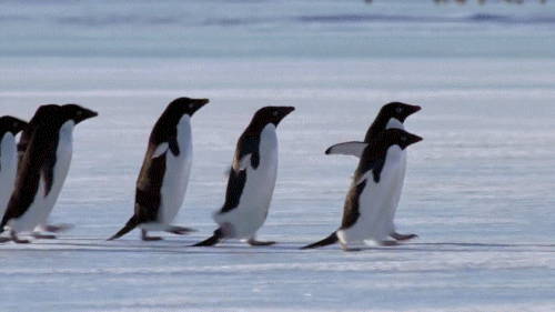不知道你还记不记得体育课上做过的鸭子步,企鹅如果是跨步走路的话场景跟我们做鸭子步差不多。