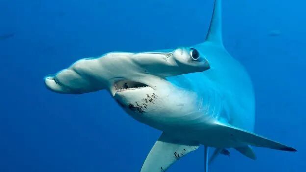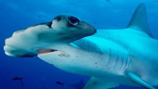 双髻鲨的头部可以达到体长的一半,从正面来看的话你可能只能看到它的头,因为身体被遮住了。