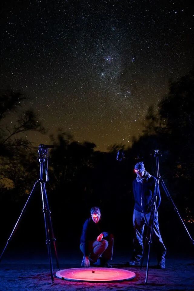 研究人员在一块大圆盘上放置了屎壳郎和粪球,并在圆盘上方安置了模拟太阳的LED灯,来证明光照对屎壳郎路线的影响。