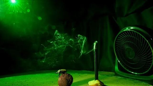 研究人员把两台电风扇相对摆放,并将屎壳郎放在中间时,他们发现屎壳郎会向各个方向前进,而当关闭一台电风扇后,它们的步调便开始统一。