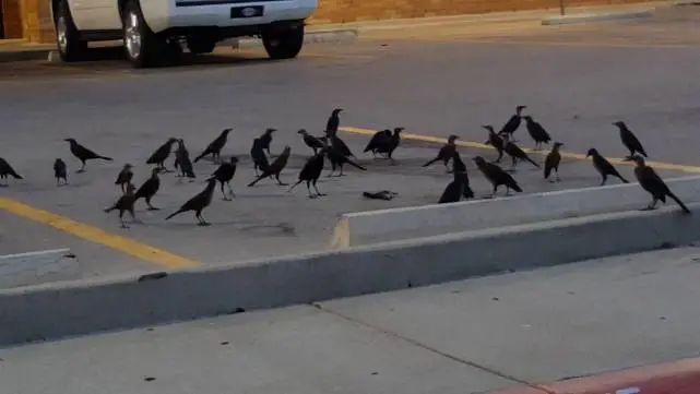 一只死去的乌鸦横躺在地,一群活着的乌鸦附近聚集,这一场景有时候又被称为“谋杀案现场”。