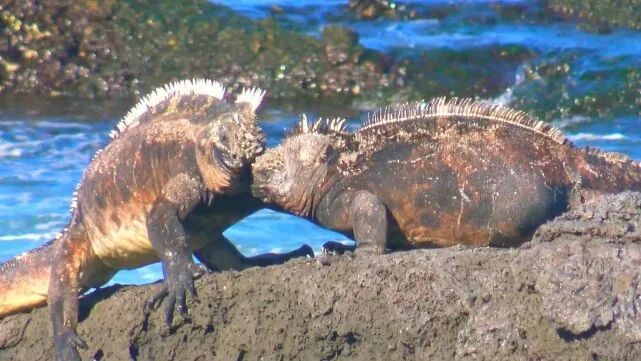 虽然为了交配权,雄性海鬣蜥也会大打出手,但是它们的“打架”就是两只雄性用头互相抵着,互相推搡而已。