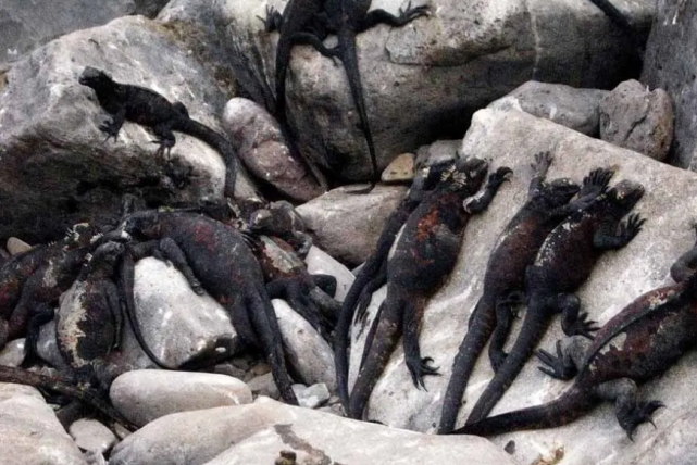 这些其实是“出海”的雄性海鬣蜥,它们一天的大部分时间都在晒太阳,等身体加热得差不多的时候,它们就不是这样趴着了,而是四条腿把身体支撑起来,以免过热。