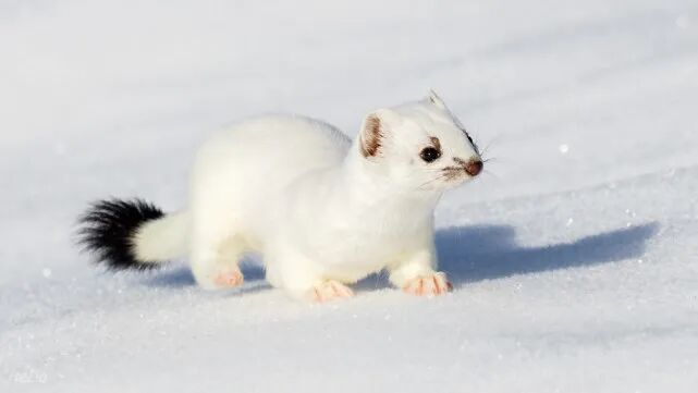 从上面这张白鼬的图片中可以看出,即使是换上白色“冬装”,它们的尾巴依然会留有鲜明的黑色,这个的目的是为了把猎物的吸引力从身体的其他地方吸引到尾巴上。