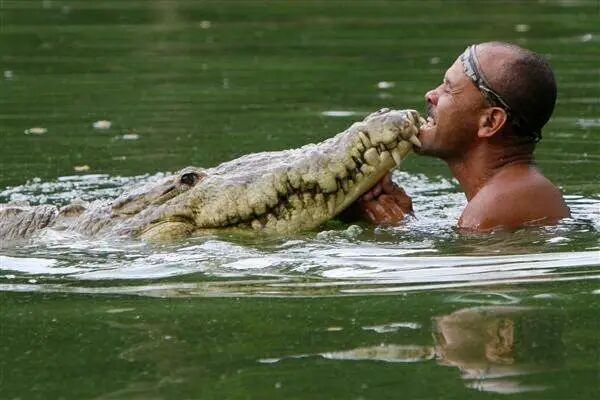 在互联网上,我们也可以找到一些鳄鱼和人类互动的场景,比如生物学家杰里米·维德就经常在水中和鳄鱼互动,有趣的是,这哥们的离婚原因是他的妻子受不了他长时间陪着鳄鱼。