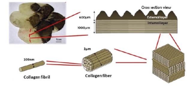 之所以巨骨舌鱼的鱼鳞防御力很强,要归功于它们内部略显柔软的胶原蛋白,这些胶原蛋白长链捆绑成纤维,每一根都是一微米厚,并组成螺旋层叠结构,它可以很好分散掉压力。