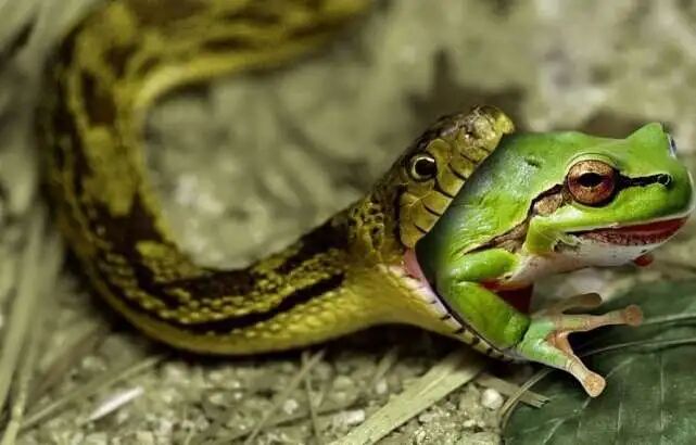 比如一条蛇捕捉到一只青蛙,它会在立马活吞下去,它不会等杀死青蛙后再吃;还有青蛙吃昆虫,它甚至看不到死掉不会动的昆虫。