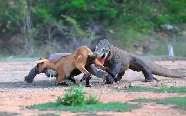 科莫多巨蜥不会主动追击猎物,它喜欢偷袭。距离猎物1米左右的距离,科莫多巨蜥会扑上去撕咬。