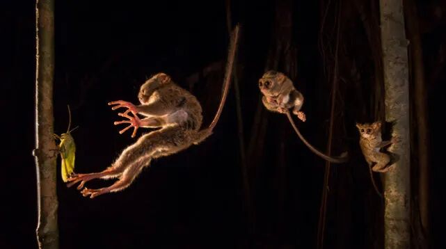 在夜间捕猎的时候,眼镜猴其实不仅仅是靠眼睛(毕竟没有明毯夜间优势不是很明显),它们还会利用自己的耳朵。