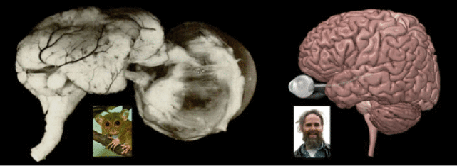与动物身体作为对比,眼镜猴超大比例的眼睛也是所有哺乳动物中最大的。我们知道眼睛是用来收集信息的,而分析信息的地方是大脑,往往越是高等的动物大脑就会越大,但是眼镜猴的眼睛比它们的大脑还大,有点妄为灵长类的味道。