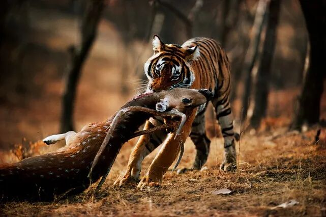 它们捕猎时基本是直接扑上去把猎物按住,然后用颈部力量将獠牙深深地扎入猎物的喉咙。