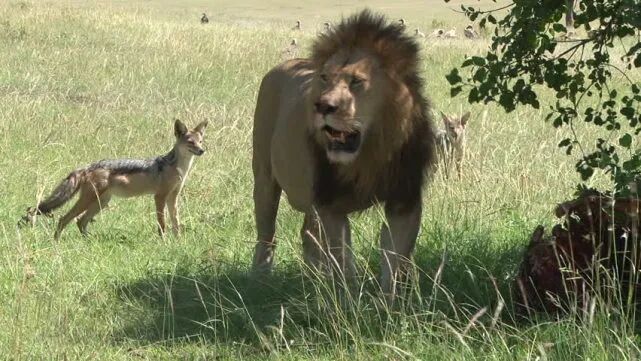 今天鬣狗捕杀了一头羚羊,胡狼看见了,就会发出特殊的声音广而告之,结果被狮子听见了,狮子立马赶来抢食,狮子和鬣狗的大战在所难免,八卦王胡狼远远围观,偶尔还会偷抢一些肉。
