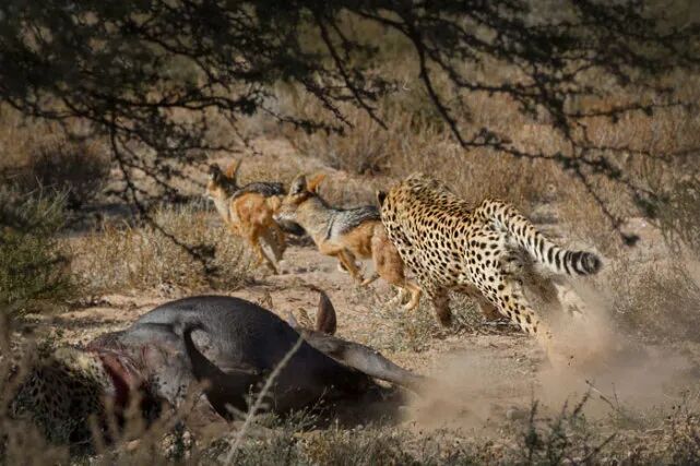 有一次三只猎豹正在享用自己的劳动成果,突然一只鬣狗赶来,也想吃一口肉,一场抢食大战要开始了,然而正当猎豹和鬣狗打得不可开交的时候,一只胡狼从远处慢慢靠近,偷偷摸摸地抢了猎豹和鬣狗正在争夺的食物,然后就走了。