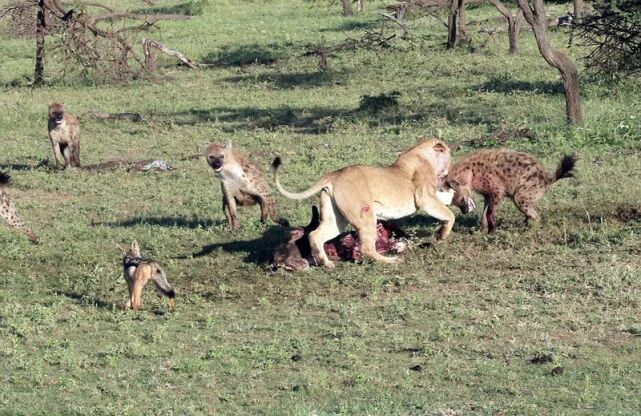于是,看到狮子吃肉的时候,会招来鬣狗抢食,当它们正在打架的时候,胡狼就会偷摸着抢走一片肉,赶紧跑。如果是看到鬣狗吃肉,也会招来狮子,采用同样的方式制造混乱抢肉。