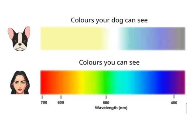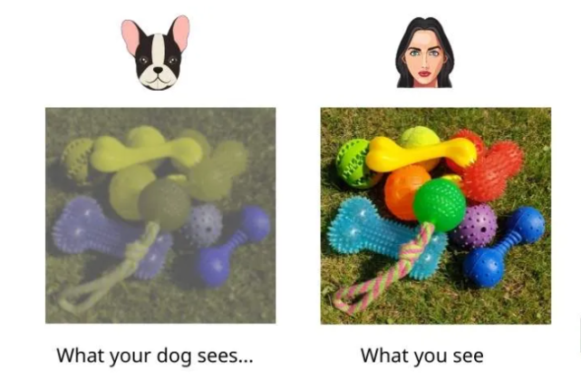 人眼对红绿蓝三原色比较敏感,但狗只对蓝紫色和黄色有反应,其他则都是灰色的。