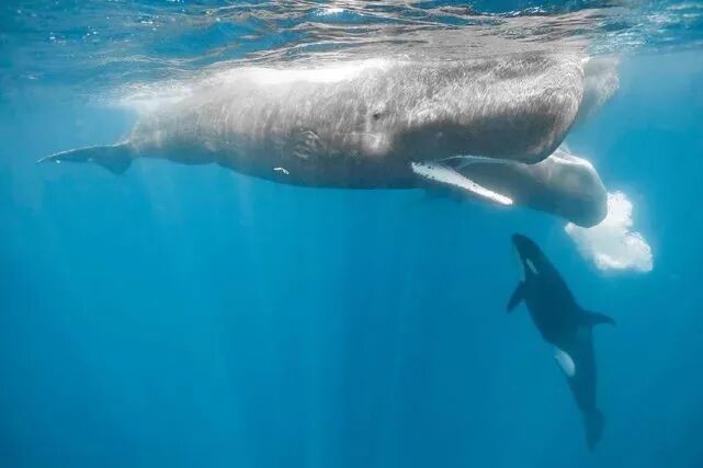 一般来说,虎鲸只攻击抹香鲸群体中的幼崽和雌性个体,成年抹香鲸并不在它的菜单之中。