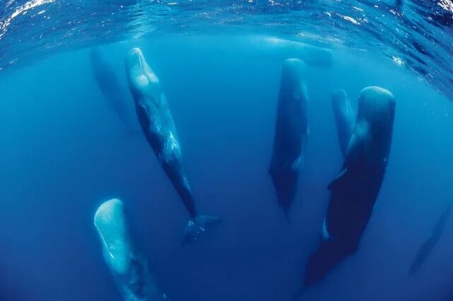 抹香鲸群体中大多是雌性和幼崽,幼崽不能像成年鲸鱼那样长时间深潜,在水面活动时,就是虎鲸最好的攻击机会。