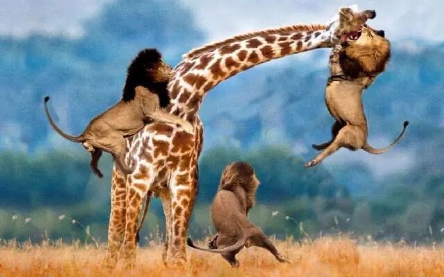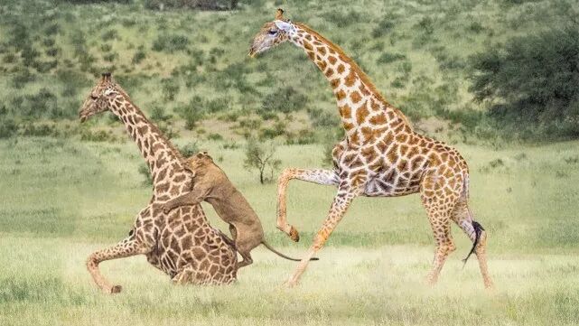 长颈鹿高大的体型,狮子进攻会很困难,常常是挂在长颈鹿身上的状态,非常消耗体力,再加上长颈鹿强大的踢腿,这样又累又危险的捕猎行为,狮群很容易放弃,并转向那些更容易捕食的猎物。